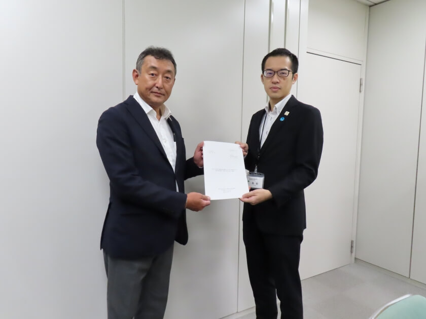 内村専務理事から産業労働局雇用就業部の島田労働施策担当課長へ要請書を手渡しました。